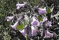| Eriodictyon crassifolium | Yerba Santa | Used by the Chumash people to keep airways open for proper breathing.[62] The US Forest Service profile[63] for Eriodictyon crassifolium provides information on species distribution; taxonomic relationships; ecological and evolutionary considerations for restoration; growth form and distinguishing traits; habitat characteristics; projected future suitable habitat; growth, reproduction and dispersal; biological interactions; ecological genetics; seed characteristics, germination requirements and processing; and plant uses including agriculture, restoration, and traditional products, plus an extensive bibliography. It is part of Riverside-Corona Resource Conservation District's resource materials collection on native plant recommendations for southern California ecoregions. | ![]() |
