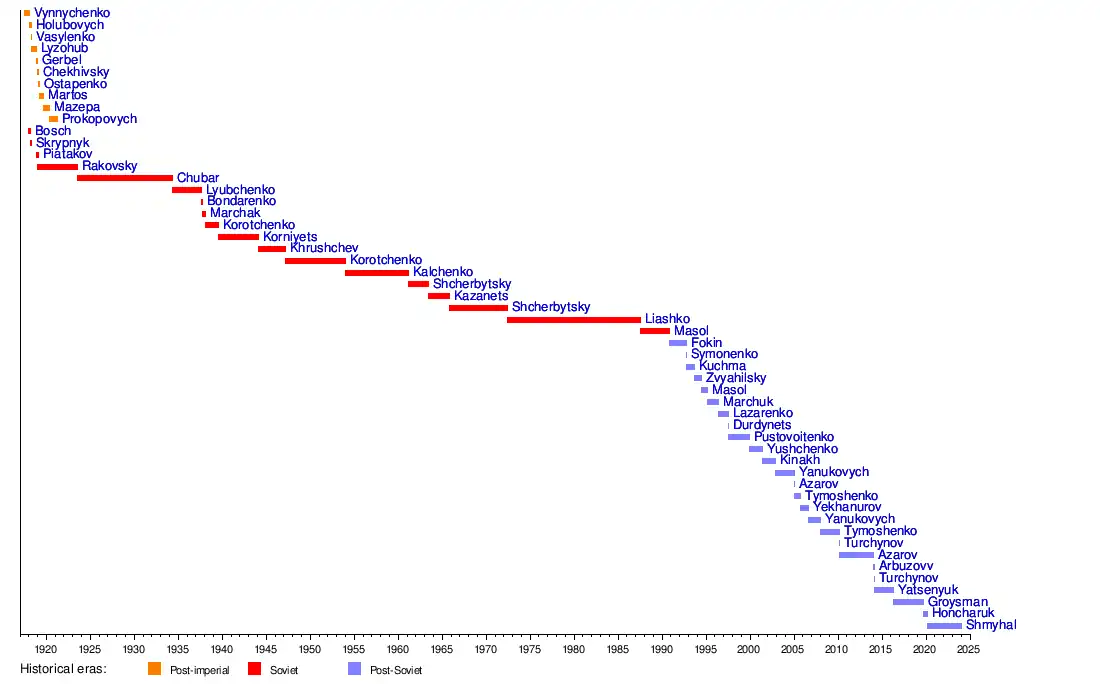 | After Azarov's resignation, Serhiy Arbuzov became acting Prime Minister, from 28 January to 22 February 2014. Oleksandr Turchynov then succeeded him until 27 February 2014. | |||||||||