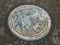 November 12, 2019 | Rob Turner | Mosaic | Unglazed ceramic mosaic tiles | 1.5m in diameter | Stratford on Avon District Council | There is five mosaics between Stratford-upon-Avon Station at Station Square and Alcester Road, on Station Approach. Depicts the history of the town. Including: The Cattle Market, Stratford's Historic Spine, The Stratford Canal and River Avon, The original Memorial Theatre and The Riverside Heritage Trail.[34] | |