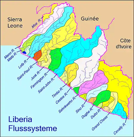 This is a list of rivers in Liberia. This list is arranged by drainage basin, with respective tributaries indented under each larger stream's name.