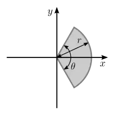 | A filled circular sector of angle θ in radians and radius r with respect to an axis through the centroid of the sector and the center of the circle | ![]() | This formula is valid only for 0 ≤ ≤ | |