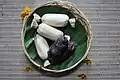 Boiled rice cake, stuffed with coconut sugar, and rolled in fresh grated coconut. It is flavoured with pandan leaves juice. |