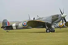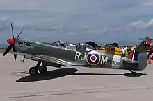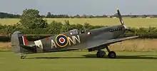 - Spitfire Tr.9 MJ772 (G-AVAV). Served with 341 Squadron, Royal Air Force as NL-W then with 340 Squadron as GW-A. Sold to Vickers-Armstrongs in 1950, converted to two-seat trainer. Carried Class B markings G-15-172. To Irish Air Corps in May 1951 as IAC 159. Withdrawn from flying in 1960. Sold to Film Aviation Services in November 1963 and stored at Biggin Hill. Sold to COGEA, Belgium in May 1964 and stored at Ostend Airport. Sold to Tony Samuelson in 1965 and registered G-AVAV in November 1966. Restored to airworthy condition in July 1967. Leased to Spitfire Productions Ltd for use in the film Battle of Britain. A forced landing was made at Little Staughton on 9 July 1968 due to engine failure, and subsequently returned to flying condition. Later sold to Sir William Roberts and displayed as part of the Strathallan Collection, coded NL-R. Sold to Doug Champlin of Enid, Arizona, registered N8R. Later registered in Germany as D-FMKN.[86] Suffered off-airport landing in field, near Woodchurch, Kent, United Kingdom, on 7 September 2015. Pilot uninjured.[87][88] As of March 2019, airworthy owned by Warbird Experiences Ltd, based at Biggin Hill airfield.[89] In August 2021, MJ772 was flown to its new home in The Netherlands with the Flying Vintage Everyday Foundation.[90]