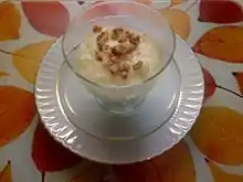 Turkey | Almond based milk pudding, often garnished with coconut shaving or pistachio nuts and is off-white in colour. |