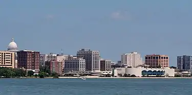 This is a list of the tallest buildings in Madison, Wisconsin.[1] Lists vary due to completion status and "approximate" heights provided, so a list of all high-rise buildings showing floor counts and construction status is probably more useful.[2] The Wisconsin State Capitol is the tallest building in Madison. The tallest building in Madison's central business district is the State Office Building. In the mid- to late-2000s more high-rise buildings were constructed.[3] A height restriction on the Madison Isthmus protects views of the Wisconsin State Capitol. The law restricts buildings to be no taller than the base of the pillars surrounding the dome (about 187 feet).[4]