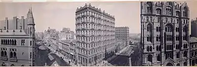 The late 1880s 'land boom' saw the construction of approximately a dozen 'lofty edifices' of 8 to 10 floors, made possible by the introduction of a pressurised hydraulic power network to operate lifts, and taking load bearing brickwork to great heights.[4] The APA Building (Australian Building) at 12 floors plus spire, was by far the tallest, and can claim to be Australia's first 'skyscraper' and amongst the tallest building in the world when completed in 1889.[4] Aside from the APA Building, a total of 11 'skyscrapers' were located in the Melbourne city centre during this period, including the Finks Building and 3 matching 'Prell's Buildings'. They were all built in an elaborate High Victorian style, with facades of stucco Renaissance Revival elements, except the APA building which was in red brick Queen Anne, prompting architectural historian Miles Lewis to comment that Melbourne had become a "Queen Anne Chicago".[5] All except two were torn down in the post war boom of the 1960s and 1970s, with the APA controversially demolished in 1981.