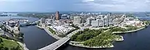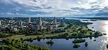This is a list of the tallest buildings in the Ottawa—Gatineau urban area that are over 90 m (295 ft) tall. Despite its size, Ottawa–Gatineau does not have many skyscrapers that exceed 100 m (330 ft) compared to other large Canadian cities. Until 1965, buildings in Ottawa were limited to 45.5 metres (149 ft) so that the 92 m (302 ft) tall Peace Tower at the centre of the Parliament Buildings could dominate the skyline.[1] The National Capital Region has a complicated system of protected view planes that are governed by the National Capital Commission and adhered to by the City of Ottawa and Ville de Gatineau.[2] Protected view planes limit the height of buildings in certain areas of the downtown cores of Ottawa and Gatineau to protect the prominence of the Parliament Buildings.