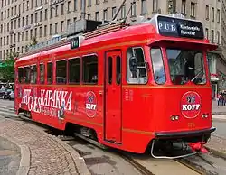 ![]() | SpåraKoff tram bar | 1995 | SpåraKoff is a HM V type tram converted into a bar in Helsinki. Known as the pub tram, the vehicle does circular tours of downtown Helsinki picking up passengers for a fee during summer months. It is operated jointly by Sinebrychoff, HOK-Elanto (part of the S Group), and Helsinki City Transport.[1] A tour ("pub crawl") takes approximately 40 minutes, travelling from the Helsinki Railway Square to Kallio, Töölö, and the Market Square, while its passengers enjoy their drinks.[2] In addition to scheduled public rounds, the tram conducts 2-hour-long reserved rounds, for private events and public outings. |