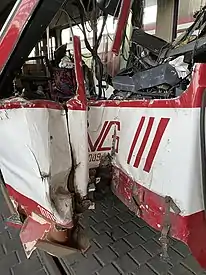 - On 4 February 2020 A tram operated by the Duisburger Verkehrsgesellschaft, derailed in Duisburg and hit a power pole frontally. Two passengers were lightly injured, the driver was stuck in his booth and was seriously injured. The tram itself got towed and was declared as destroyed.[31]