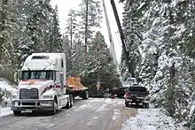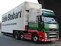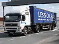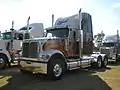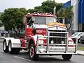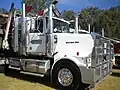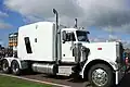 • Conventional cabs are the most common in North America and Australia. The driver is seated behind the engine and it is similar to a pickup truck.[2] Conventionals are further divided into "large car" and "aerodynamic" designs, as opposed to underneath with no nose like in a cab over. A "large car" or "long nose" is a conventional truck with a long (6 to 8 foot (1.8 to 2.4 m) or more) hood. With their very square shapes, these trucks experience a lot of wind resistance. They typically consume more fuel. They also provide somewhat poorer visibility than their aerodynamic or COE counterparts. By contrast, Aerodynamic cabs are very streamlined. They have a sloped hood and other features to lower drag. The front doors are behind (and mostly above) the front tires. Access to a conventional cabin is commonly by steps at or near the fuel tank(s) behind the front tires.