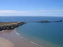 Penmaen Burrows, a sandy headland west of Three Cliffs Bay, is part of the National Trust's Penrice Estate, bought with Enterprise Neptune funds in 1967.[14] The headland had been inundated by sand, probably in the 14th century, burying the now-ruined stone church. It was excavated in 1861 and remains sunk into the sand and overgrowth.[15]