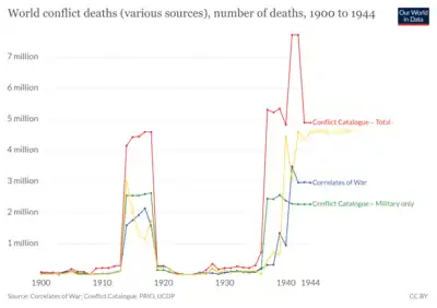Graph of global conflict deaths from 1900 to 1944 from various sources.
