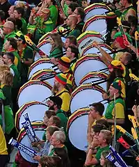 However, Lithuania's economic transition left the country in a difficult financial situation, and LKF could hardly count on state funding. As a result, the team had to search for the financial supporters by themselves in order to play internationally. Šarūnas Marčiulionis had experience and contacts in the United States from being the first USSR player in the NBA, playing for the Golden State Warriors.[29] Consequently, he, along with Donnie Nelson (son of Marčiulionis' then-coach Don Nelson), searched for financial supporters that could finance Lithuania's participation in the international games and the 1992 Summer Olympics. George Shirk wrote a story about this on the San Francisco Chronicle, and once American rock band Grateful Dead read the newspaper, they decided to help the team. Drummer Mickey Hart added that the story resonated with the bandmembers for being "a struggle for life, liberty and freedom." The bandmembers donated $5,000 to Marčiulionis, and helped launch a tie-dyed jerseys trade that would feature Lithuania's national colors[30] and the iconic, trademarked 'Slam-Dunking Skeleton' created by N.Y. artist Greg Speirs. The skeleton dunking a flaming basketball, nicknamed "Skully", was the artist's interpretation of how the Lithuanian team rose from the ashes to victory.[31] The artist's profits would be passed onto the Lithuania national basketball team and a fund for Lithuanian children.[32] The Lithuanians were favourable to the garish shirts because, according to Nelson, it was a great contrast to "all those years of those Soviet colors, nothing but blues and grays". Arvydas Sabonis even said that "My first impression of [the jerseys] was: Wow, this really is a free Lithuania". The skeleton, nicknamed "Skully", was enshrined into the Basketball Hall of Fame, being the only cartoon character to be enshrined in any sports Hall of Fame.[32] New versions of the Skully jerseys were featured in the following two Olympic Games.[33][34]