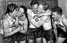 The efforts were successful – the Lithuanians became the champions of Europe for the first time, defeating all their opponents and with Talzūnas being picked as the tournament's most valuable player. Following the final victory over Italy, the famous Lithuanian tenor Kipras Petrauskas even interrupted his performance at the State Theatre to joyfully announce the triumph of the national basketball team. The crowd then rose to their feet and together sang the Lithuanian anthem.[17] The team returned to a warm reception, with thousands gathering at a train station in a way Kriaučiūnas compared to "like we, here in America, greet the president."[18] Basketball regained its ground immediately, and had its popularity rise abruptly, especially among students. Gymnasium teams from almost all counties competed in student games, teams were assembled in firms and basketball courts appeared all around the country. According to future player Stepas Butautas, "In every yard hoops are being made from barrels. Children, teenagers are throwing balls into them, others – even a sock crammed with clouts. Our Veršvai Primary School teacher K. Požemecka built two poles, made hoops from a willow and said: 'We will play basketball'."[19] Future team coach Vladas Garastas added that "as kids we started using a barrel to make a hoop. We didn't have a ball, we stuffed in grass or whatever we could find".[20]
