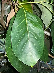 Litsea bindoniana, known as the big-leaved bollywood is a rainforest tree in the laurel family. A small to medium-sized bushy tree endemic to the rainforests of tropical Queensland, Australia.[2] It features large leaves with attractive yellow venation, 25 cm (10 in) long by 10 cm (4 in) wide. They are dark green above, and paler and somewhat hairy below. The leaf stalks are hairy. The small (0.7 cm diameter) greenish flowers are fragrant and occur from March to May. They are followed by fruits which mature from September to October, being a black drupe. Regeneration is from fresh seed, after removing the fleshy aril around the seed.[3]