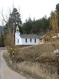 The Little Church in the Pines is a c. 1902-1908 building in the former mining town of Salina in Boulder County, Colorado.[3] The church held regular Sunday School classes for children, and services whenever a traveling minister came to town.[4] As the mining boom came to an end and the town's population shrunk, the building fell into disuse, and briefly served as a mine office before being abandoned.[5] In 1948 it was purchased by a neighborhood group and has been used ever since for nondenominational worship and community events.[5] The Little Church in the Pines was placed on the National Register of Historic Places in 1989.