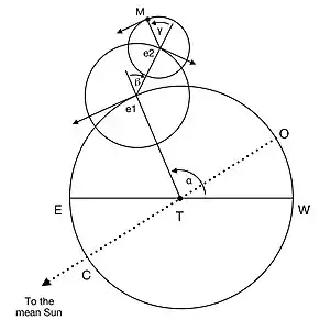 The Moon itself, represented by the point M in the diagram, moves uniformly from west to east around the circumference of the second epicycle so that the period of the angle γ is half a synodic month.[9] Copernicus states that whenever the point e1 lies on the line joining the Earth to the centre of its orbit (represented by the dotted line OTC in the diagram, of which only the point T here lies in the Moon's orbital plane), the Moon M will lie precisely between e1 and e2. However, this can occur only once every 19 years, when this line coincides with the line of nodes WTE. At other times it does not lie in the moon's orbital plane and the point e1 cannot therefore pass through it. In general, then, while the Moon will be close to conjunction or opposition to the Sun whenever it lies precisely between e1 and e2, these events will not be precisely simultaneous.