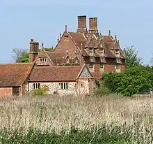 Hautbois Hall is a 10,842 sf private residence set in grounds by the River Bure. It was built in the reign of King Edward VI in 1553, and remains a splendid example of a Tudor manor house with pretensions. Probably erected on the site of an existing manor house, the house contains a medieval staircase. Three storeys in height and four bays in length, it is only one room deep. The two-storey kitchen block, while almost identical in style to the main black, is 17th century in date. Tall chimneys and finials on gables and dormer windows increase the building's height, while stone mullioned windows and diapered brickwork add to the building's impressive appearance.[11] It is thought that the family of the original builder went bankrupt about a century after its building and the buildings passed into the ownership of a charity connected with the church of St Peter Parmentergate, Norwich.[12] A painting dated 1840 shows large extensions, removed in a late-19th-century restoration.[13]