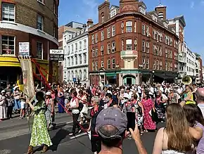 The church also hosts the procession in honour of Our Lady of Mount Carmel which is central to the community and is thought to be the first outdoor Roman Catholic religious event held in England since the Reformation in the 1500s. The procession is held annually and has been since at least 1896 (only not being held during World Wars I and II) when Queen Victoria granted the police chief of Holborn special permission for the parade to take place. In recent years an Italian market, known as a sagra, has developed near by.[4] The procession has a smaller attendance then in previous years. Pre-1960s the entire community would have a festa and on the day and would hang flowers and lights over the street and play music late into the night.[5]