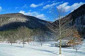 The French and Indian War (1754–1763) led to the migration of many Native Americans westward to the Ohio River basin.[6] The United States acquired the Last Purchase, including what is now Upper Pine Bottom State Park, from the Iroquois in the Second Treaty of Fort Stanwix in October 1784.[8] In the years that followed, Native Americans almost entirely left Pennsylvania;[6] however some isolated bands of Natives remained in Pine Creek Gorge until the War of 1812.[9]