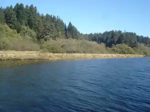 The lowermost mile of channel is through Quaternary alluvium and dune sand of an estuarine floodplain typical of coastal inlets along the Cascadia subduction zone.[3] Land seaward of U.S. Route 101 forms Little River State Beach and Clam Beach County Park. Little River State Park was established in 1931.[4] The floodplain upstream of the Highway 101 bridge is cleared as grazing pasture, and the upland portion of the drainage basin, including the former company town of Crannell, is in private ownership growing forest products. In 2014, the North Coast regional water board recommended that the Jolly Giant Creek be listed as an impaired waterway due to E. coli contamination 600 times greater than normal.[5]