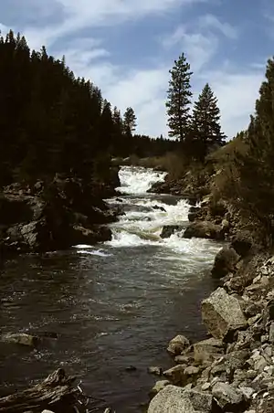 The Payette National Forest and Nez Perce National Forest cover portions of the Little Salmon River watershed, but at no point does the river flow over federally protected lands. However, the river is also completely free flowing and unobstructed by dams or dikes. Most of the watershed receives about 20 to 25 inches (510 to 640 mm) of rainfall per year. On higher mountain slopes rainfall can be up to 40 to 50 inches (1,000 to 1,300 mm) annually, and on the highest west-facing mountains, precipitation can be much higher than that.[3] About half of the river is inhabited by namesake salmon, but at river mile 24.7 (river kilometer 39.8) Little Salmon Falls, at the confluence with Round Valley Creek, marks the end of the limit for anadromous fish. However, this barrier may have been different at some point in the past, because Native Americans have traditionally fished on the Little Salmon well upriver of the falls. Other than salmon, steelhead, Pacific lamprey, several different species of trout and dace, and other species of fish, are also present. Cottonwood, willow, dogwood and alder grow along the banks of the river.[3]