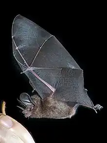The little big-eared bat (Micronycteris megalotis) is a bat species in the order Chiroptera and family Phyllostomidae.[2] It is from South and Central America particularly Colombia, Venezuela, Guyana, French Guiana, Brazil, Peru, Ecuador, Bolivia, Argentina, Paraguay, Suriname and Trinidad. Though its exact population is unknown, it is considered widespread and occurs in protected areas, although deforestation may be a minor threat, it is classified as Least Concern. It is found in multistratal evergreen forests and dry thorn forests and forages near streams and is found hollow trees, logs, caverns, or houses with groups up to twelve. The head and body length measures at 44 millimetres (1.7 in) for males and 45 millimetres (1.8 in) for females. Males usually weigh about 5 grams (0.18 oz) while females weigh 5.7 grams (0.20 oz).[3]