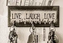 "Live, Laugh, Love" and variants on the phrase have appeared on framed posters, wall decals, ornaments, cushions, mugs, bed linen, jewellery and even on coffins.[3][4] The Live Love Laugh Foundation, a mental health organization in India founded by Deepika Padukone, takes its name from the phrase.