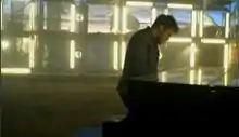 Allen playing a grand piano in front of a giant countdown clock in the desert scene.