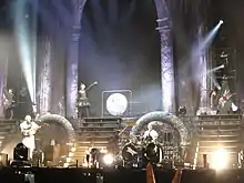 After an introductory video subtitled "Metal Resistance Episode IV: Reincarnation", as three masked figures in white robes appear on the stage, only to disappear. Next, the three members ascend from beneath the stage,[16] performing "Babymetal Death" with ABBA-style dance moves with Kami Band supporting them.[18] Kami Band support the three members, playing most of the music, as well as performing solos during "Catch Me If You Can".[16] Songs from Metal Resistance performed included the Black Babymetal song "GJ!", the Su-metal solo "Amore", and an English version of the song "The One", with narration played between songs to transition between their musical styles.[16] The show's final song "Road of Resistance" contains a Wall of Death formation in the audience, and Moametal, Yuimetal, and Su-metal thank the audience afterwards, saying "You are also precious to me. I love you!", "It is thanks to you that we are here today! We love London!", and "We are going back to Japan, but remember we are always on your side! See you!", respectively.[7]