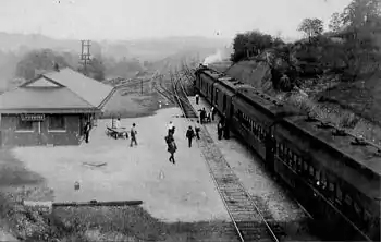 The West Penn Railroad extended past Livermore alongside the canal in 1854, and a station was built in 1864, providing connections to Blairsville and Saltsburg. Grading from Blairsville to the Allegheny River was completed in 1857, and the same year, the state sold the canal to the Pennsylvania Railroad. Another grade was built in 1882 to bypass a hill. These tracks were used for 25 years until 1907, when a new straight line bypassed the canal curves. A new station was also built.[4]