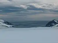 The principal mountain formations on the island comprise Tangra Mountains (32 kilometres or 20 miles long and 8.5 kilometres or 5.3 miles wide, with Mt Friesland rising to 1,700.2 m or 5,578 ft[10][11]), Bowles Ridge (6.5 km or 4 mi long, elevation 822 m or 2,697 ft), Vidin Heights (8 km or 5 mi, 604 m or 1,982 ft), Burdick Ridge (773 m or 2,536 ft), Melnik Ridge (696 m or 2,283 ft) and Pliska Ridge (667 m or 2,188 ft) in the eastern part of the island, and Oryahovo Heights (6 km or 4 mi, 340 m or 1,115 ft), and Dospey Heights (6 km or 4 mi, 265 m or 869 ft).[2] The local ice relief is prone to change; in December 2016 the elevations of Mount Friesland and St. Boris Peak were 1,693 m (5,554 ft) and 1,699 m (5,574 ft) respectively, making the latter the summit of Livingston in that season.[12] According to the American high accuracy Reference Elevation Model of Antarctica (REMA), Mount Friesland is 8 m (26 ft) higher than St. Boris Peak.[13]