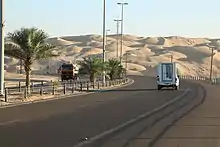 Liwa Oasis is about 97.6 km (60.6 mi) south of the Persian Gulf coast and 150 km (93 mi) southwest of the city of Abu Dhabi, on the northern edge of Rub' al Khali desert. It is centered around 23°08′N 53°46′E / 23.133°N 53.767°E and stretches about 100 km (62 mi) east-west, along an arch curved to the north. It consists of some 50 villages. The geographic and economic center of the oasis is Muzayri`, where the highway from Abu Dhabi enters the oasis and then divides to the east (65 km (40 mi) to the easternmost village, Mahdar Bin `Usayyan) and west (45 km (28 mi) to the westernmost village, `Aradah). According to the census of population of 2005, the population was 20,196.[2] Earlier estimates judging from satellite images which gauged the population at 50,000 to 150,000, were too high.[3] The villages of Liwa Oasis are the southernmost settlements of Abu Dhabi and of the United Arab Emirates. The southern border of Abu Dhabi with Saudi Arabia, which runs at a distance between 16 and 35 km (9.9 and 21.7 mi) to the Oasis, is a straight line in the Rub al Khali desert, which is largely uninhabited. Mahdar Bin `Usayyan is the southernmost village of the Emirates, and also the easternmost of the oasis. 10 km (6.2 mi) south of the border, and 40 km (25 mi) south of the eastern part of the oasis is the Saudi oil facility Shaybah. However, there is no road linking Liwa Oasis and Shaybah, and no border crossing. A modern, multi-lane highway connects the oasis area to the capital, Abu Dhabi.