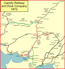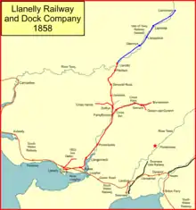 The Llanelly Railway and Dock Company was an early Welsh railway system. It opened its first short line and a wet dock at Llanelly in 1834, and soon went on to build a longer line from Llanelly to serve pits in the Amman Valley, and then on to Llandilo, reached in 1857. The Llanelly company leased and worked the Vale of Towy Railway on to Llandovery, from 1858.