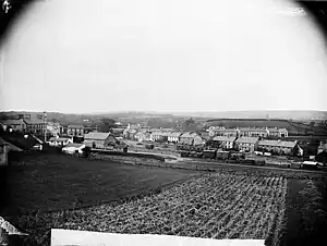 ![]() General view of Llanybydder from the east showing the station, railway yards and houses c 1885 | |