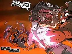During the attack of Selene's undead force on Utopia, Alani was attacked by three reanimated Acolytes: Cortez, Mellencamp, and Delgado. She was saved by Deadpool, who was in her room playing with her toys and reading her diary when he heard her screams. Discovering that the former Acolytes would revive and reform after any injury, Deadpool spent 20 minutes "subduing them with lethal force" until he ran out of bullets. Finally, he was about to be eviscerated by Mellencamp, when Loa dove through the reanimated mutant, disintegrating him in the process. Seeing that Mellencamp did not reform, Deadpool threw Loa at the remaining Acolytes, forcing her to disintegrate them as well.[6]