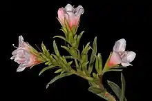 Flowers are present between May and December.[3] The bell-shaped flowers range from pink to blue in colour and are borne in compound cymes.[3][4] The colour is variable, but typically the inside and back are pink, washing into blue tips.[4] The young flowering axis is compact with the flower buds loosely arranged to form a globose unit. They spread slightly in the fruiting stage.[2] The stamens are dissimilar in length and typically do not protrude past the rest of the flower.[2] The staminal scales are ridge-like and do not have lateral lobes.[3] They are inserted well below the throat of the corolla tube, 2.5–3.5 mm (0.098–0.138 in) above the base of the corolla tube[2]