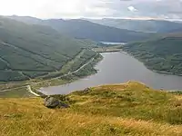 Loch Tarsan; is a freshwater loch and impounding reservoir located 13 kilometres Northwest of Dunoon, on the Cowal peninsula in Argyll and Bute, Scotland. This three-armed Reservoir extends into both Glen Tarsan and Glen Lean. It supplies water to the Striven Hydro-Electric Scheme (also known as the Cowal Hydro-Electric Power Scheme). The larger of the two dams is 17.6 metres high and was completed in 1953. The water that is collected in the loch is piped to the hydro-electric generating station, located at Ardtaraig, at the head of Loch Striven.[1]