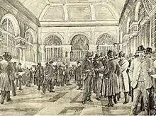 The loggia was ceded to the Chamber of Commerce in 1839 and underwent a general renovation to a design by Giovanni Battista Resasco: on this occasion the two open sides, those facing Piazza Banchi and Via Banchi, were closed with windows. From 1855 it housed the Genoa Stock Exchange and the Commodities Exchange. In 1912 the former was transferred to the new premises in Piazza De Ferrari, while the Commodity Exchange remained in Banchi.[2][4]