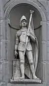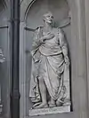 In addition, to hosting the entrance to the museum housed in the upper galleries, the loggiato is known for its display of statues of famous Tuscans housed in niches carved from the inner ground floor pilasters. It is stated that Cosimo I de Medici for his original plan for the Uffizi planned to display statues of famous Tuscans in the ground floor. In 1574, just before the death of Cosimo, the sculptor Vincenzo Danti had his statue of the former Duke placed in the ground floor.[1] His son, Francesco, in 1584 substituted this statue with one by Giambologna, standing on a plinth on the second floor, above the arches of the interior of the river corridor, with Cosimo flanked by two figures, Rigor and Equity. However, not until the middle of the 19th century, was such an ambitious plan to display a statues of 28 famous Italians active in Tuscany was put into effect.