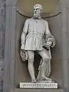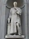 The project was restarted in 1834-1835 as an initiative of the editor and philanthropist Vincenzo Batelli,[2] who wished to celebrate the Italian genius. Initially, he hoped to fund his project with a public subscription and engage young local artists, early in their careers.[3] Public funding, however, fell far short of what was needed. In 1842, the Grand-Ducal government selected a "Florentine Deputation to complete the decoration of the Logge degli Uffizi and honor Illustrious Tuscans". The deputation selected the subjects and approved the statues based on designs with no modifications allowed.[4] Their choices guided by the government of the Grand-Duchy. For example, the suggestions for including Frate Guittone d'Arezzo (1230 – 1294) and the jurist Cino da Pistoia (1270 – 1336) were declined. Ultimately the project was funded by a lottery, and experienced sculptors were patronized. Prior to installation or completion of the statues following sculptors died: Bartolini, Pampaloni, Pozzi, Nencini, Leoni, and Torrini.[5] The original sculptor for the statue of Guicciardini declined the commission, believing the historian had not been evil.?! The series was completed in 1856.[6]