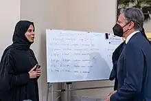 Lolwah Rashid Mohammed Al-Khater (Arabic: لؤلؤة الخاطر) (born in Doha, Qatar) is a Qatari diplomat who is the first Qatari woman to hold the position of Spokesperson for the Qatari Ministry of Foreign Affairs and Assistant Foreign Minister of Qatar.[1][2][3] Since March 2023, she has served as Minister of State for International Cooperation at the Ministry of Foreign Affairs.[4]