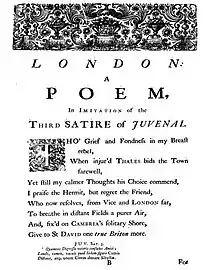 London is a poem by Samuel Johnson, produced shortly after he moved to London. Written in 1738, it was his first major published work.[1] The poem in 263 lines imitates Juvenal's Third Satire, expressed by the character of Thales as he decides to leave London for Wales. Johnson imitated Juvenal because of his fondness for the Roman poet and he was following a popular 18th-century trend of Augustan poets headed by Alexander Pope that favoured imitations of classical poets, especially for young poets in their first ventures into published verse.