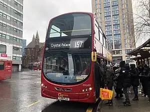 Upon being re-tendered, it was retained by Travel London with a new contract commencing on 2 December 2006.[3] Route 157 was included in the May 2009 sale of Travel London to Abellio London.[4][5] On 3 December 2016, Arriva London commenced operating the route after winning the tender with 18 existing Alexander Dennis Enviro400 double deckers.[6][7] The route was based at Norwood garage, however, drivers were allocated to Thornton Heath garage. This was due to Thornton Heath not having enough capacity available following route 64 moving there in August 2016.[1] On 2 December 2023 this route passed back to London General from their Merton garage with existing double deckers introduced. At the same time, the PVR decreased to 17. Some drivers are also based at Croydon garage.