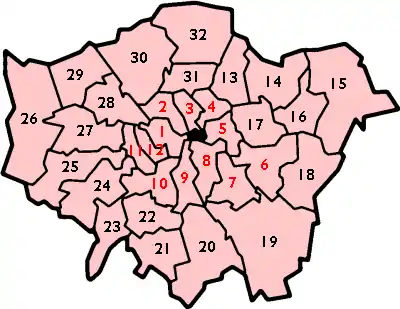 Map of London boroughs as numbered in Schedule 1 of the Act. Inner London boroughs are labelled in red, while the City of London is shown in black.