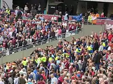 The black-and-white seating design from the Olympics was replaced with a white, blue and claret design. The new design includes West Ham's name on the East Kop Stand and symbolic crossed hammers on all lower-tier stands, and the retention of the 2012 shard design on the upper tier, albeit in new colouring to match the stadium's anchor tenant.[63] Work continued through 2016 to transform the stadium into a home for West Ham, with the club's colours and giant model West Ham shirts added to the stadium concourse.[64] A West Ham store and coffee shop was opened on 23 June.[65] In February 2019, it was announced that the East Stand would be renamed in honour of Billy Bonds.[66] In an attempt to make the London Stadium more like their home ground, in April 2019 a £250,000 claret-coloured pitch surround was announced and installed.[67] In February 2020, West Ham announced planned alterations to the stadium introducing two new lower-tier stands moving supporters closer to the pitch, many by more than four metres (13 feet).[68] In March 2020, West Ham opened a sensory room in the stadium for fans.[69] On 6 April 2022, West Ham announced that the capacity for football matches will be bumped from 60,000 to 62,500 and the lower tier of the west stand is to be reconfigured to make the stadium more football-oriented.[70] The redevolepemt ment an increase of the overall capacity to 68,013.[2] In December 2023, the news media suggested that West Ham United are considering a way to utilize the entire capacity for their matches.[71]
