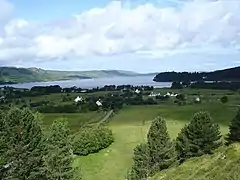 Looking North-East down the main Londubh road, at the croft in fields from the common grazing. Loch Ewe in the background.