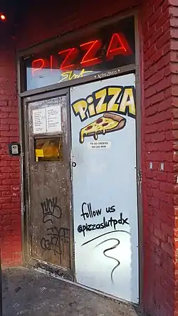 ![]() Pizza Slut at Dante's in 2022; previously, the pizza window housed Lonesome's Pizza | |