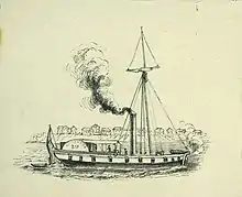 The military and scientific expedition planned to travel up the river by steamboat and collect scientific information of the northwest.[4] In the spring of 1819, Long and his scientists began their journey from Pittsburgh, Pennsylvania on the Western Engineer that Long designed for the expedition. They traveled along the Ohio River and Mississippi River, and arrived at St. Louis on June 9, 1819. From there, they made their way along the Mississippi and Missouri Rivers, headed for the Council Bluff area of present Nebraska.[4][5] Dr. William Baldwin, assigned the roles of botanist and surgeon, became quite ill with tuberculosis. He left the expedition at Franklin, Missouri on July 18, and died on August 31, 1819.[6][7] Continuing on the Missouri River, the scientists occasionally left the boat to find and document flora and fauna. They reached Council Bluff on September 19, the first steam boat to travel that far up the Missouri River.[4] They set up the Engineer Cantonment, staying there throughout the winter. The Sixth Infantry Regiment camped nearby at the Cantonment Missouri.[4][5]