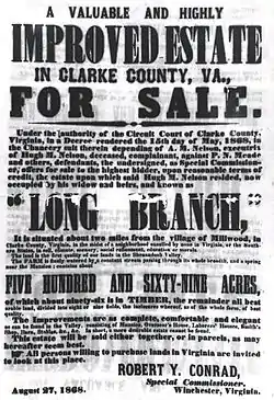 Long Branch is a historic family seat in Millwood, Virginia built in the early 19th century; named after the creek that runs through the property. Built on approximately 1000 acres (currently 400 acres) by Robert Carter Burwell in 1811 and owned by the Burwell-Nelson family until 1957. The property was placed on the National Register on October 1, 1969.